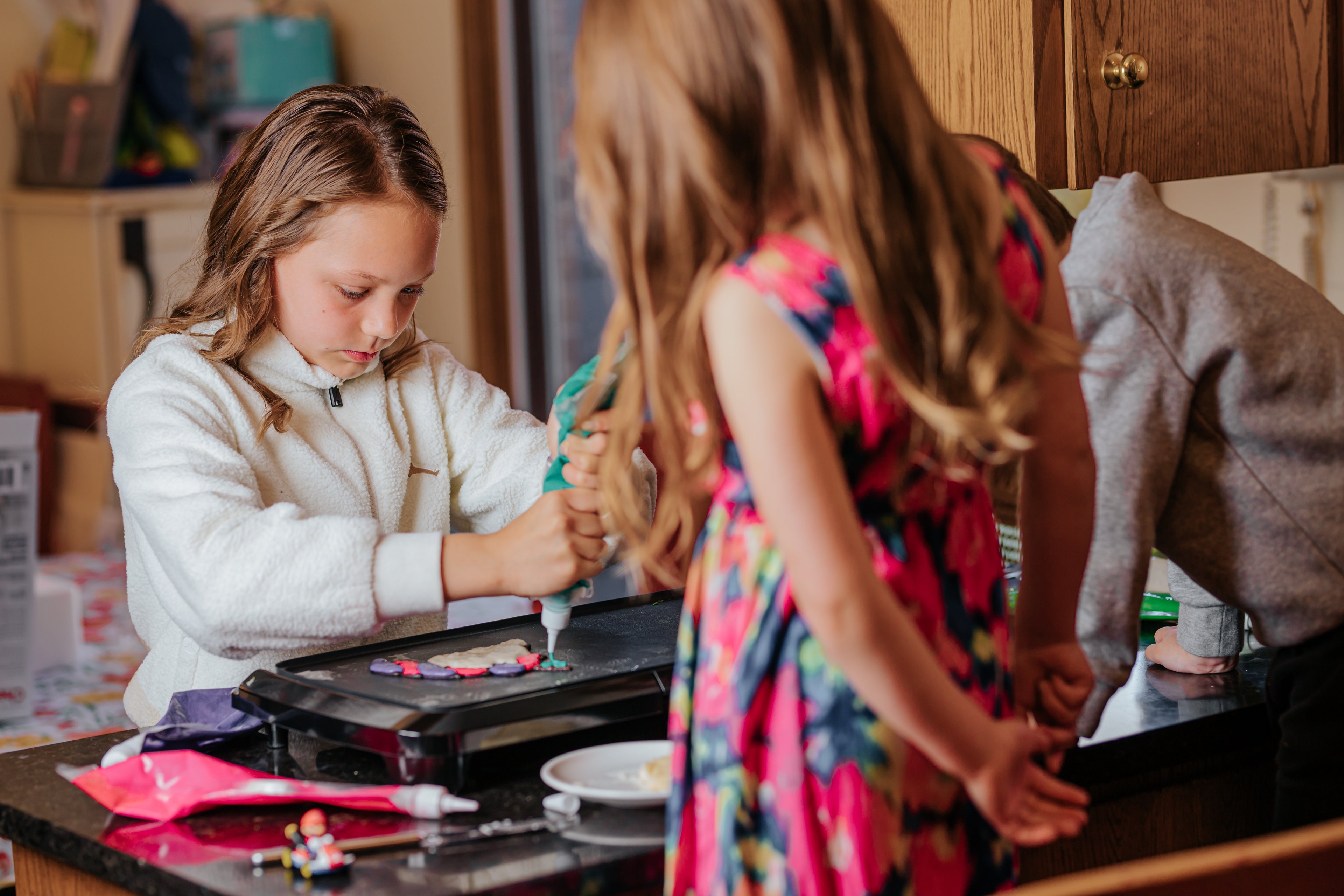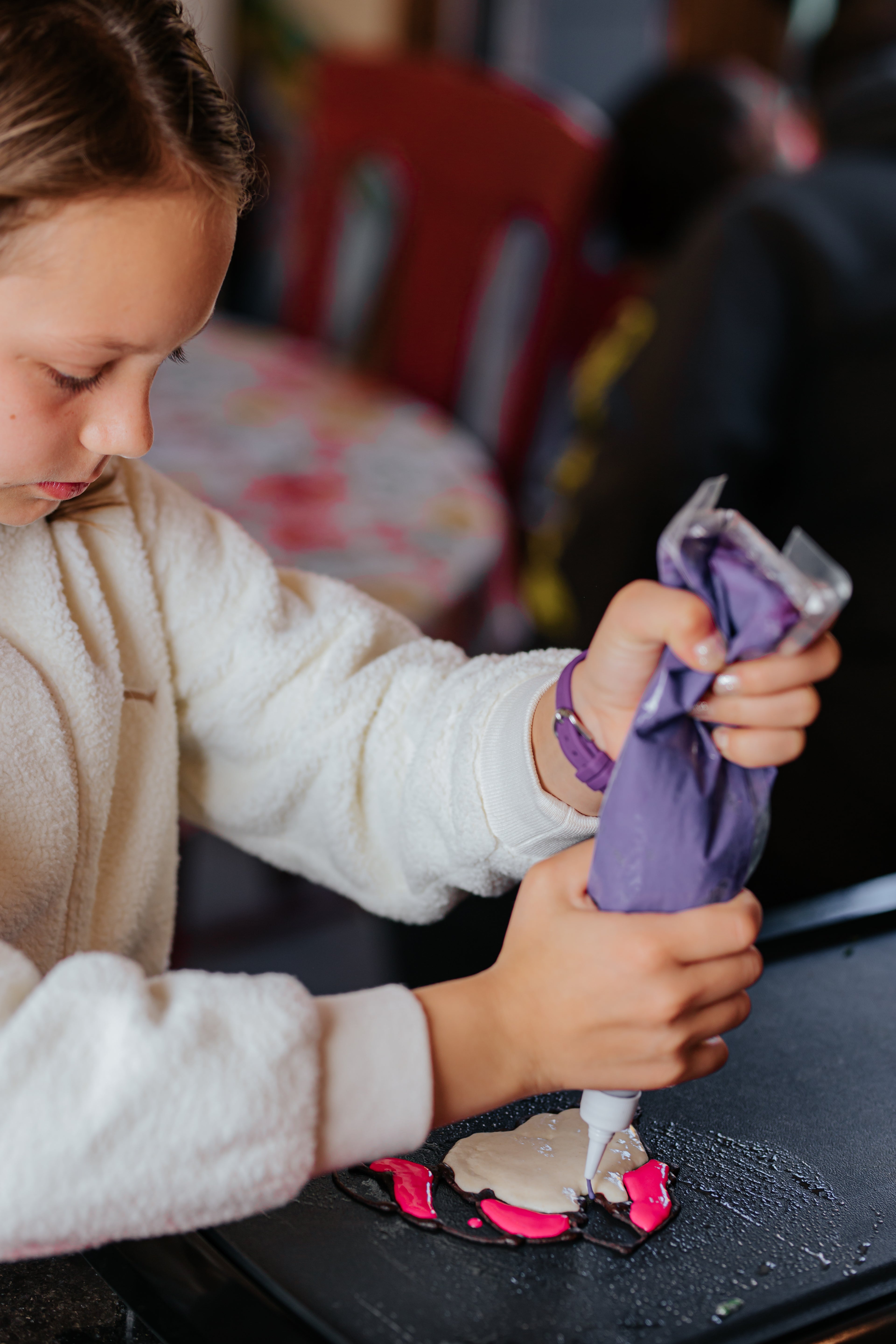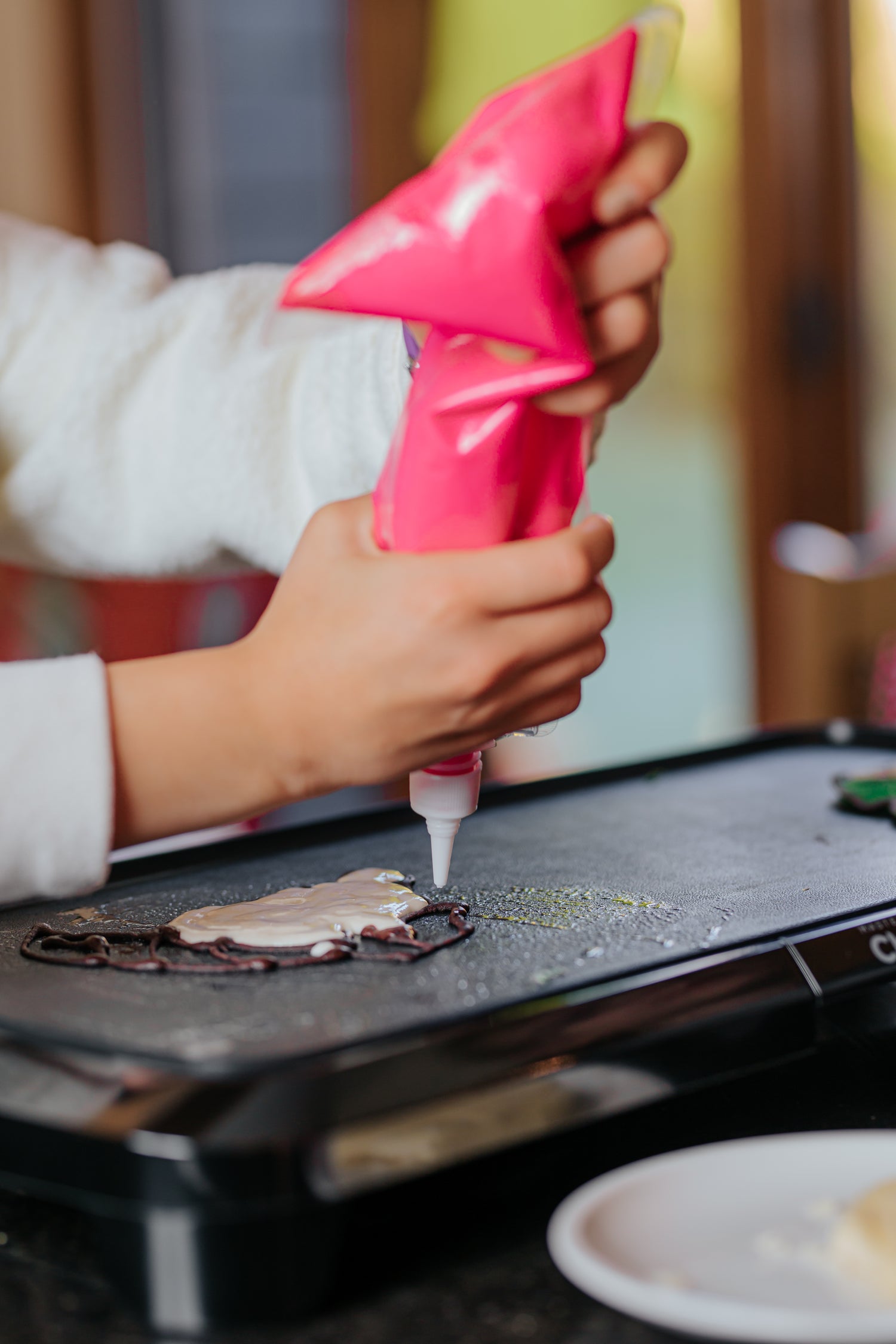 If they are little, may be start with the mixing of the pouches, they’ll love seeing the color mix. If you’re using a griddle, keep it on low heat with a towel to protect the edges and they can try making their own design.